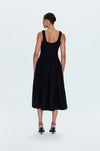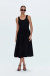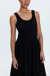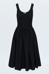 Textured day dress crafted from a lightweight fabrication designed with warm weather in mind. Featuring a smocked tank style bodice that falls into a ruched waistband and a fully proportioned midi skirt.