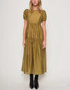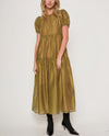 The enchanting Aria maxi dress was meticulously crafted to captivate. The tiered, flowing skirt cascades gracefully with each movement, creating a silhouette that exudes ethereal charm. Delicate short puff sleeves introduce a hint of romantic allure, while the high-waisted bodice elegantly enhances your figure. Made from a Chartreuse sheen fabrication, this dress is an exquisite choice for any special occasion