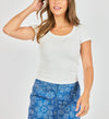 This is the tee you’ll reach for on repeat. Designed with a flattering scoop neckline and a softly fitted silhouette, this one layers easily, wears well solo, and feels like a fresh upgrade to your basics drawer.